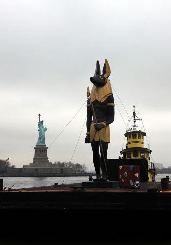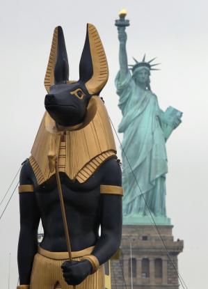 To celebrate the new King Tut exhibit that opens later this month in New York City, an enormous statue of Anubis was barged up the river and will eventually take its place in Times Square. I love these pics of Him beside our own Lady of Freedom. Some conspiracy theorists contend that Lady Liberty was based on—shock, shock—a Pagan model of…even more shocking…Isis! OMGoddess!