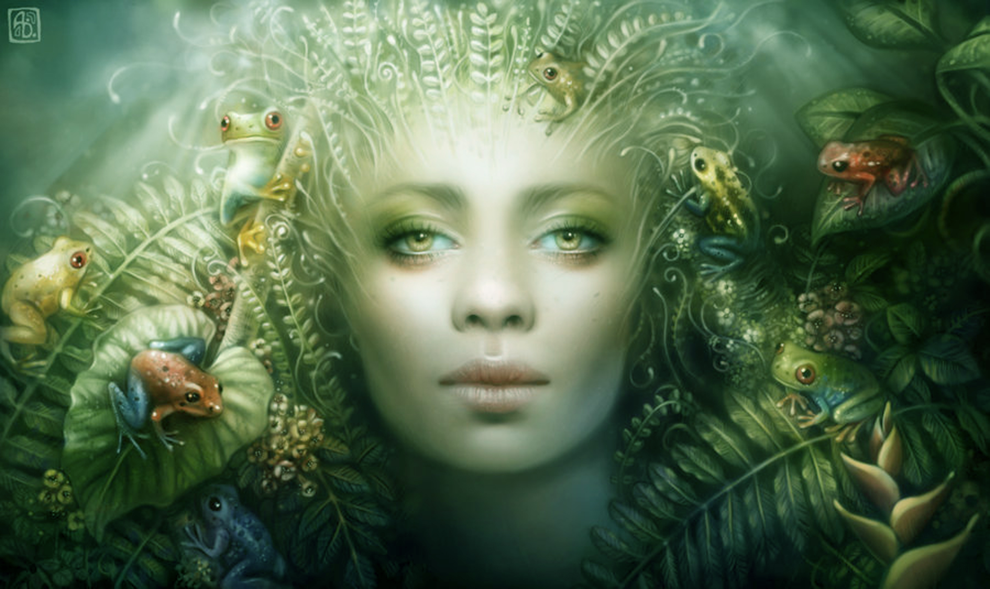 The first thing that surprised me was that instead of the weak response I expected, I had a very strong response from Her. She came to me in vision in anthropomorphic form, as a woman with huge green eyes and pouty lips. Her strong thighs were prominent and She was slightly bow-legged. All Her features were froglike and individually strange, but they came together beautifully. She did have completely froggy feet and even that was working for Her.