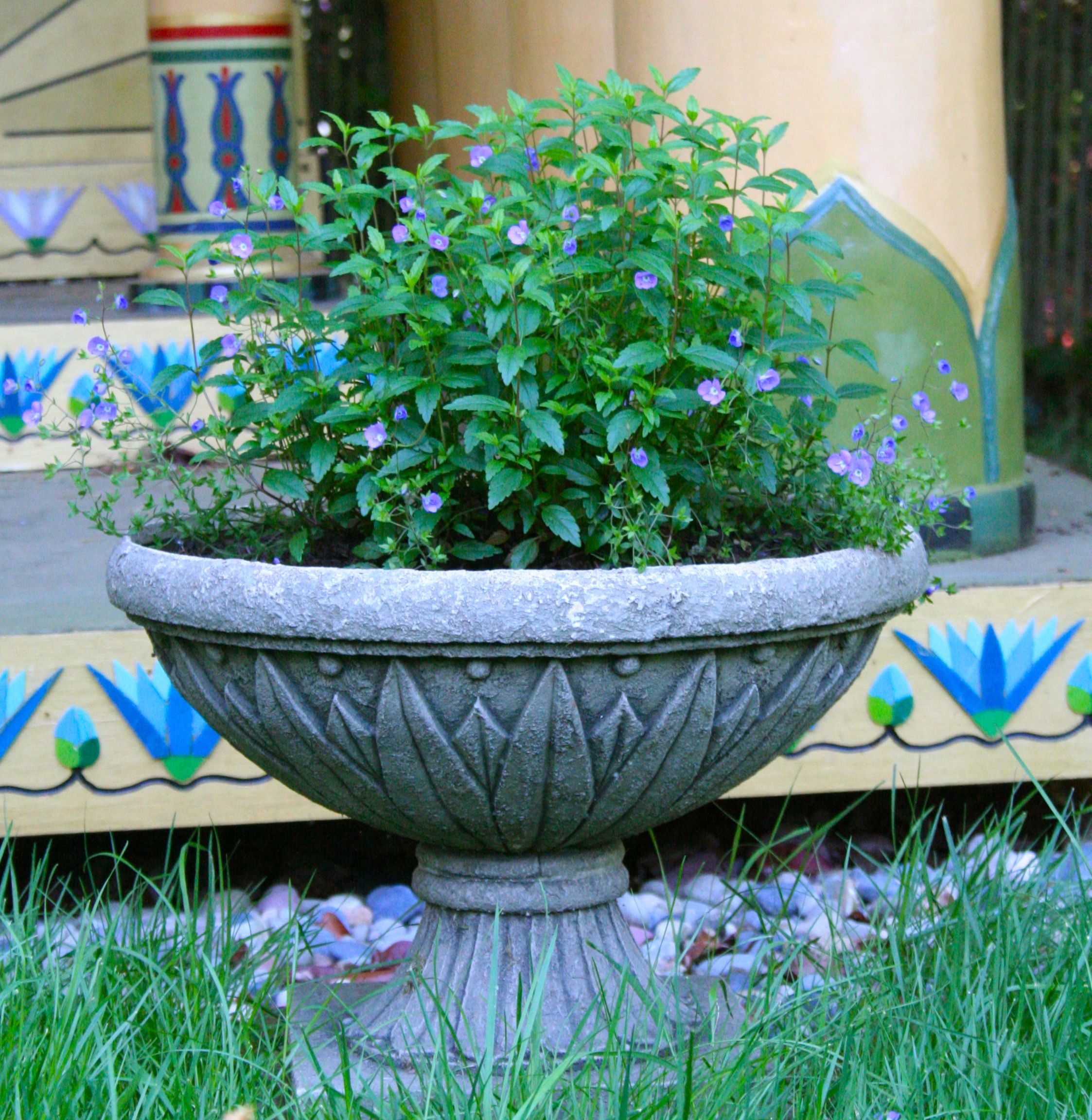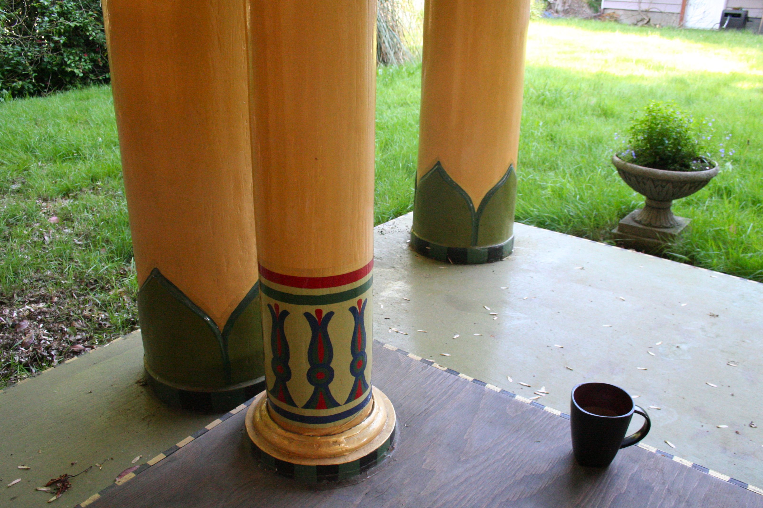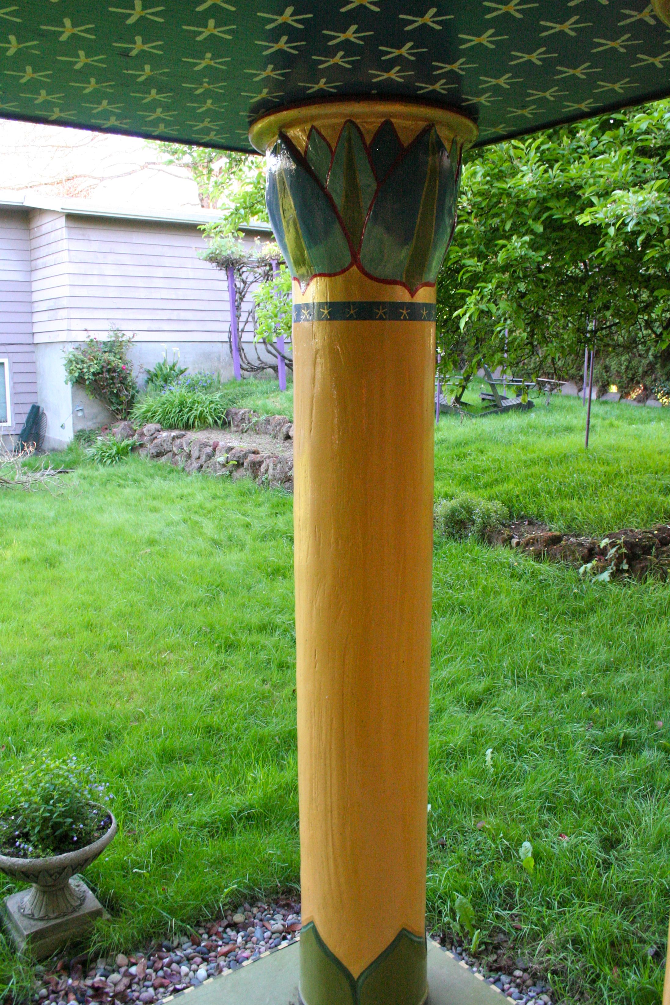 The House of the Lotuses; it is about the size of a large gazebo, which is how we explain it to the neighbors: it’s an Egyptian gazebo!The temple is decorated with glass lotuses, each cut by hand and cemented in place.One of two lotus planters in front of the temple; this year, we have speedwell growing, in other years, it has been grassesThe roof of the temple is painted as Mother Nuet’s starry bellyThere are eight large outer pillars and two smaller inner pillars supporting the temple; they are shiny because they were urethaned to withstand the Pacific Northwest rain; yes, I had to have my coffee with me!A single lotus pillar; that bit of purple you see behind it, is the grape arbor of DionysosAnother shot of the lotus pillars, Nuet’s sky, and the glass decoration on the top of the templeThe inner shrine area is illuminated with the rays of The Radiant One and decorated with delicate purple and white lotusesThe copper repousé shrine doors slide open so that the winged Isises guard the sacred image withinThe Radiant Isis in Her shrineA side view of the House of LotusesPhilae-Portland, Portland-Philae. Coincidence? I think not.