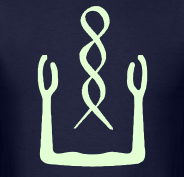 • Raise my arms above my head with fingertips touching; this forms the top loop of the wick glyph. Breathe in and vibrate: ISET HEKAET (“Isis the Magician”); vizualize the Goddess sending Her heka to me, filling the loop I am making with my arms with the electric blue light of Magic. (No doubt influenced by sci-fi and fantasy flicks, yes, I usually see heka energy as electric blue.) Take a moment to see my crown shen (singular of shenu) illuminated.