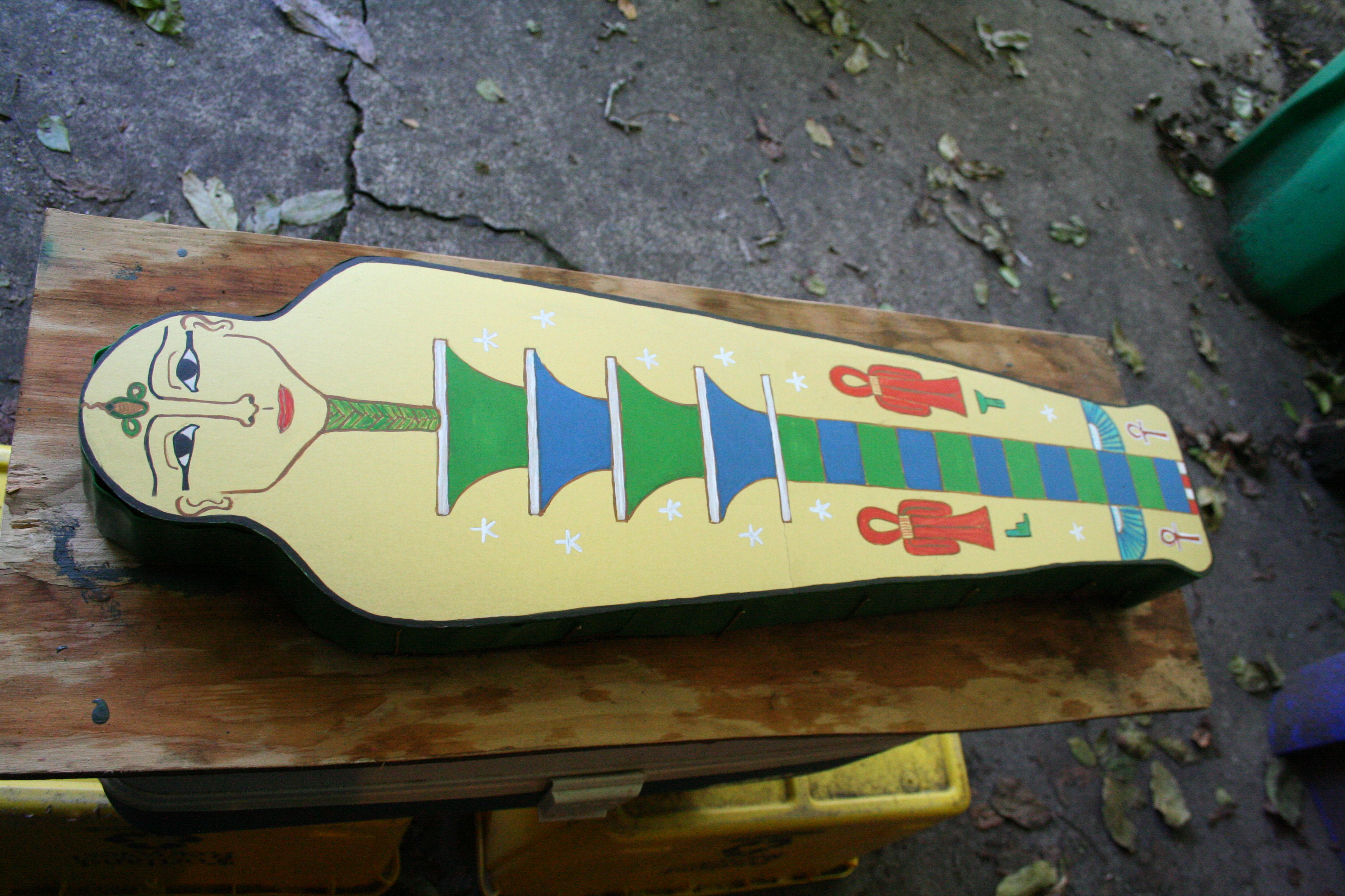 To make our sarcophagus of the God complete, I made a coffin lid from foamcore. We happened to have some gold foamcore in the garage (yes, we have many strange and magical things in our garage). I painted on the designs, exacto’ed it out, and we had our sarcophagus.