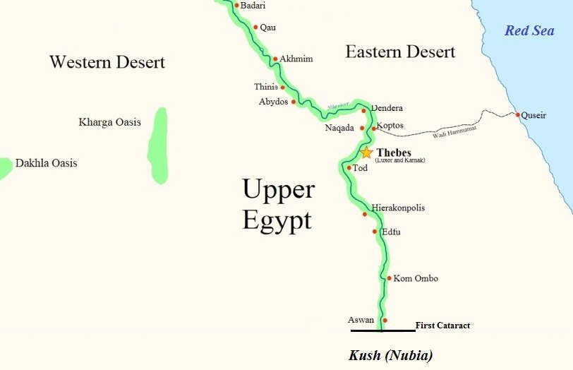 Isis and Min shared a temple complex at Koptos (Gebtu in ancient Egyptian, Qift in modern). It is in Upper Egypt, near Denderah and Thebes. The site is connected to the Red Sea by the Wadi Hammamat (meaning “Valley of Many Baths), a dry riverbed. The wadi contains important 3,000-year-old petroglyphs; in ancient times, it led to major Egyptian mining areas and was a key trade route.