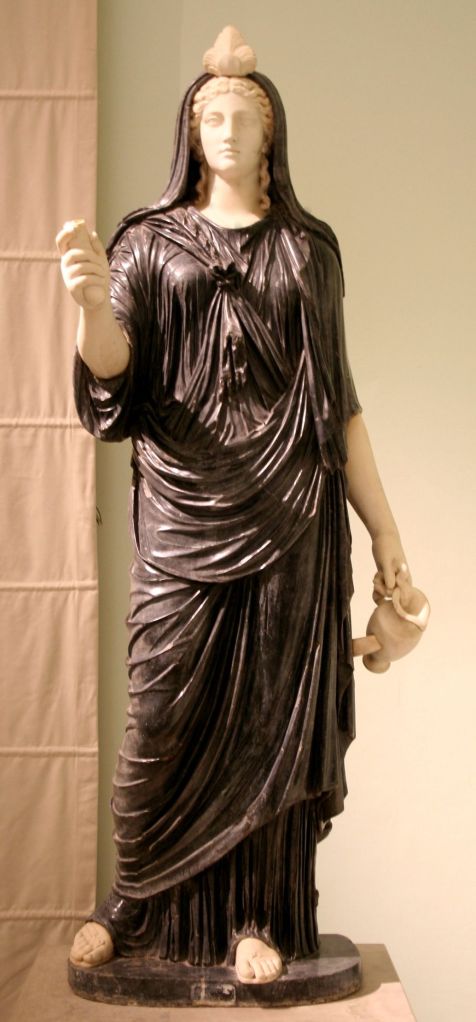 To recap: the knotted garment was originally an Egyptian fashion, especially seen on royal and noble women. The Ptolemaic queens, who were Greek but trying to be more Egyptian, adopted the knotted garment as an outfit that Egyptian royals wore. As part of “becoming Egyptian” the Ptolemies promoted the cult of Isis, Osiris/Sarapis, and Horus/Harpokarates. Egyptian tradition already associated the pharaoh with Horus, the son of Isis. To emphasize their Egyptian-ness, the Ptolemaic queens began to associate themselves with Isis and with Hathor. By the end of the dynasty, Isis was the more prominent Goddess and the queens, wearing their Egyptian knotted outfits, were strongly identified with Isis.