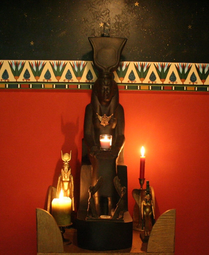 In ancient Egypt, they held Festivals of Lights in which the entire town or city would light oil lamps that would burn throughout the night—entirely equivalent to our own stringing of lights at Halloween, Yule, or the Winter Festival of Lights that my own city of Portland puts on every February. In Egyptian homes, it was in the space before the main gate of the house that a lot of a family’s festival activity—from lamp lighting to barbecuing and feasting, would take place. I assume this enabled everyone to celebrate together and to see each other do so. In my imagination, I envision Egyptian neighbors vying with each other over elaborate displays of oil lamps.