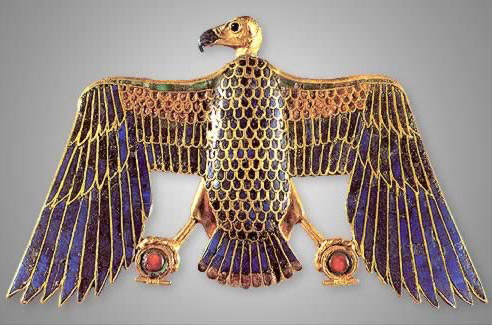 As Isis the Kite protects Osiris by enfolding Him in Her wings, so in one of the Books of the Dead, a vulture-headed Mut is shown enfolding Osiris in the same way. On a pectoral found in Tutankhamon’s funerary equipment, a vulture, labeled “Isis”, guards the king.
