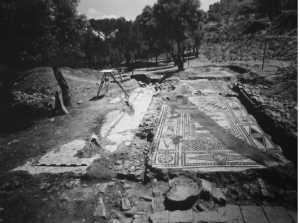 The House of the Mysteries of Isis is just down the hillside from another house with important mosaics, the House of the Bakchic Thiasos. So here again, we find Isis and Dionysos in close proximity; these two houses are, in fact, the only two buildings in the area.