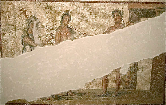 In another room in the same house, a mosaic has been identified as a representation of the Navigium Isidis, the Festival of the Ship of Isis, also described by Apuleius. This would strengthen the case that the female figure in the previous mosaic is intended to be Isis, but there has been controversy over the identification of this scene as well. A third mosaic in the house features theatrical masks, which would seem to relate it to the mosaics in the House of the Bakchic Thiasos. Nothing that has been discovered so far, however, makes that certain.
