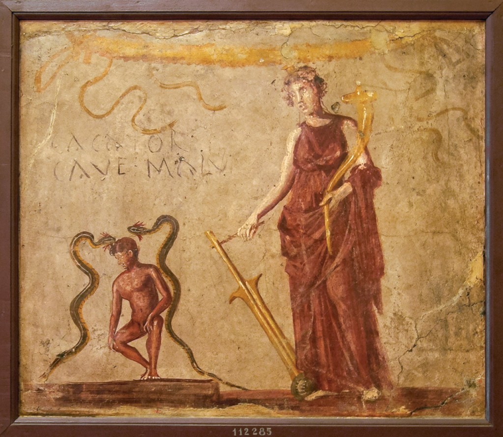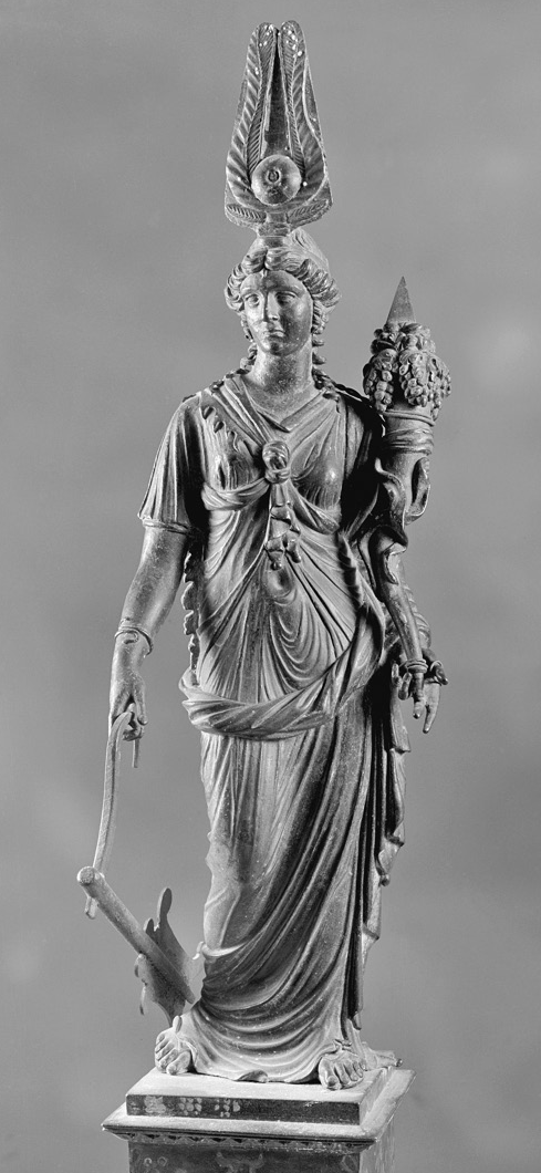 The Roman version of Agathe Tyche was the Goddess Fortuna. She was extremely popular throughout the Roman world. Every Roman emperor kept an image of Fortuna in his sleeping quarters in hopes of bringing good fortune to his reign. Anyone with particularly good or bad luck was said to have their own “Fortuna.” Fortuna even had Her own oracular shrines. Her symbols include the Wheel of Fate, a sphere representing the World that She rules, the cornucopia of plenty, and a rudder with which She steers Fate. When Fortuna is depicted specifically as Isis Fortuna, She also wears the horns and disk crown of the abundant Egyptian Cow Goddess; thus reuniting the Egyptian symbols of cow and rudder in the figure of the Goddess Isis.