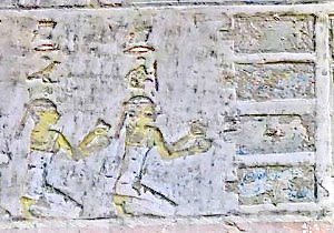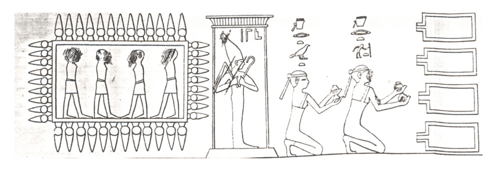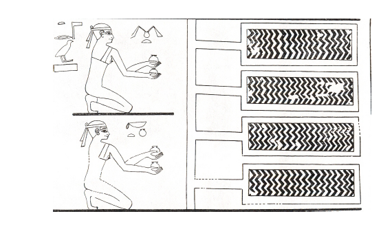 In this papyrus, we learn that the demdjets are present throughout the funerary rites. At some point, the demdjets move simultaneously, perhaps in ritual motion or dance. They are there when the deceased is summoned to revivification. And they have speaking parts. In the New Kingdom, we have several more instances of demdjets. They are shown as two kneeling women with nu water pots and they are watering “the desert necropolis.” In one case, one woman is labeled menkenu and one demdjet. (Alan Gardiner suggests menkenu is a title of Isis, while demdjet is a title of Nephthys.) In another case, one is called demdjet and one is called kenut (menkenu and kenut may be different versions of the same title).