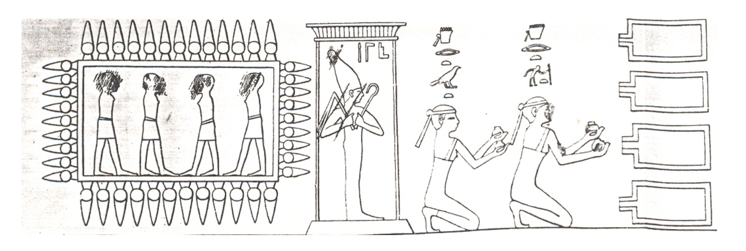 But here’s where it gets more interesting for Isiacs. In the last New Kingdom example (tomb of Paheri, if you must know), we find the same scene—women kneeling with nu pots, dressed in the same way—but this time, They are labeled Djeret Weret (Great Kite) and Djeret Nedjeset (Lesser Kite). In this time period, we know Who the Great Kite and the Lesser Kite are; They are Isis and Nephthys. So, the women depicted may be human ritualists portraying the Goddesses, which we know was done in Egyptian ritual. In additional—but very damaged—scenes in two of these tombs, we see the demdjet no longer kneeling, but standing with her/Her right arm raised, elbow bent, and fist clenched while her/Her left clenched fist is placed at her/Her chest. It reminds me of the henu gesture, but standing.