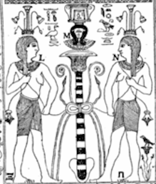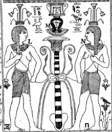 And that funny word, Iynx, with which the Mensa’s Isis is labeled? It can be a magical tool—the so-called strophalos, or wheel, of Hekate—a bird used in erotic magic, or a type of Being in the Chaldean system. As a Being, Iynges (plural) are “transmitters” of higher-level energies to the lower worlds. The Hathor-headed pillar in the center of the image (above) is what Kircher says is “Isis under the form of Hekate.”