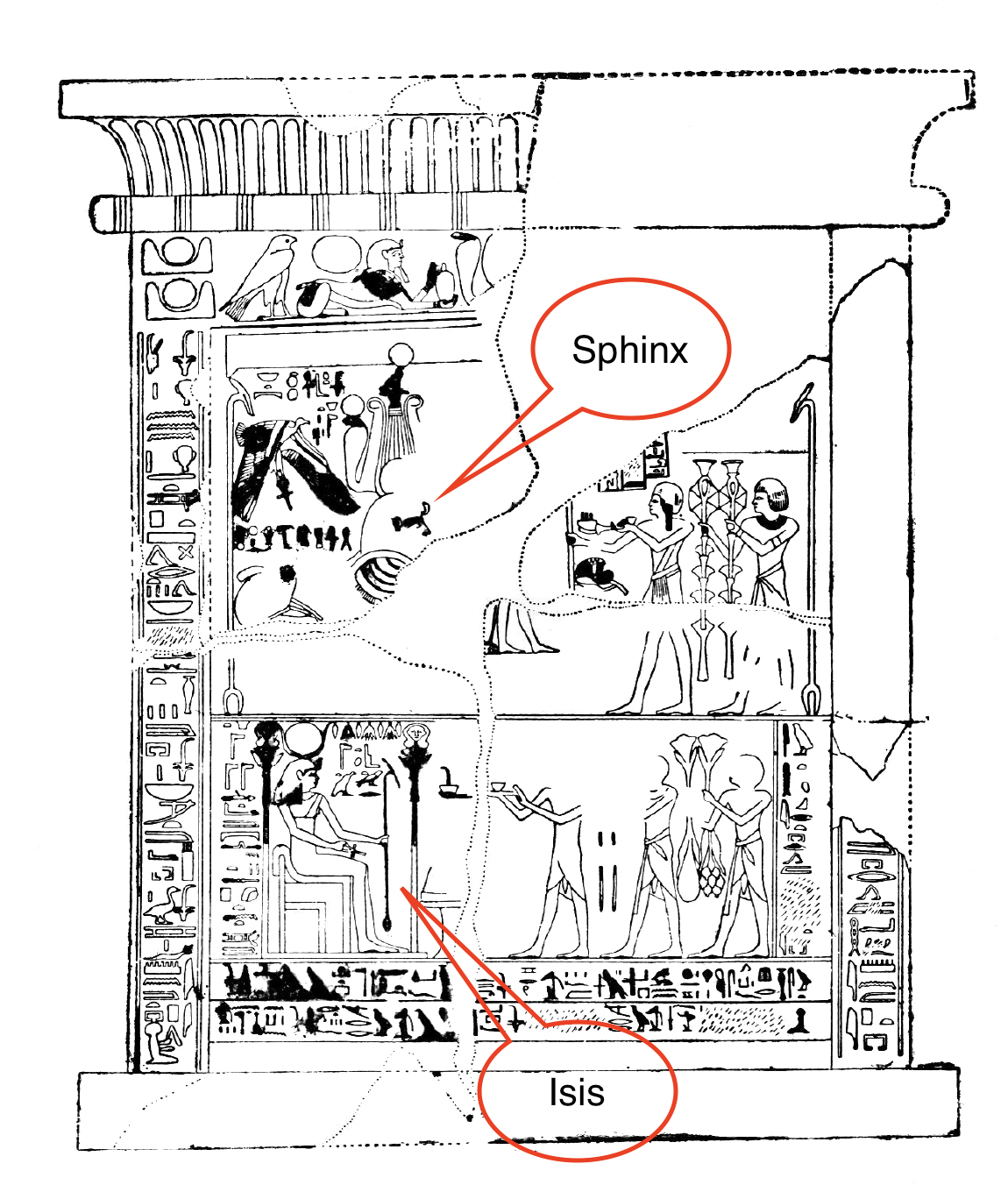 Prior to the Inventory Stele, we find Isis on a Giza stele of Prince Amenomopet, a prince of the 18th dynasty. This is on the so-called Stele C found in the Sphinx Temple and which shows the Sphinx and Isis, wearing the Horns and Disk Crown and within a shrine, receiving offerings from the prince. The image is captioned, “Isis, the Great, the Divine Mother, Queen of the Gods, One in Heaven, Who Has No Equal, the Elder [daughter of] Atum.” Dating on the stele is controversial (so what else is new in Egyptology?), but if the 18th dynasty dating is accurate, then Isis and the Sphinx are being worshiped together at Giza by at least that time.