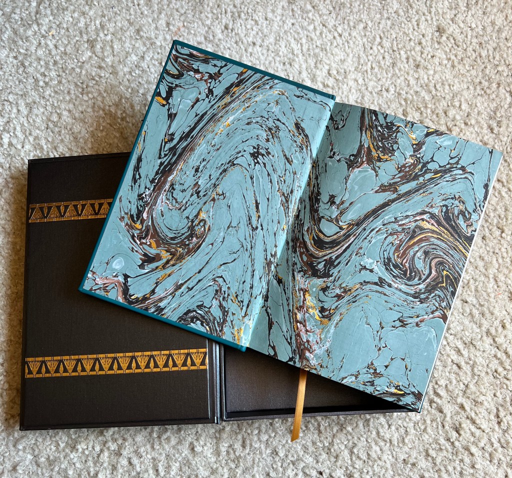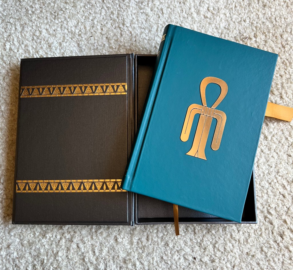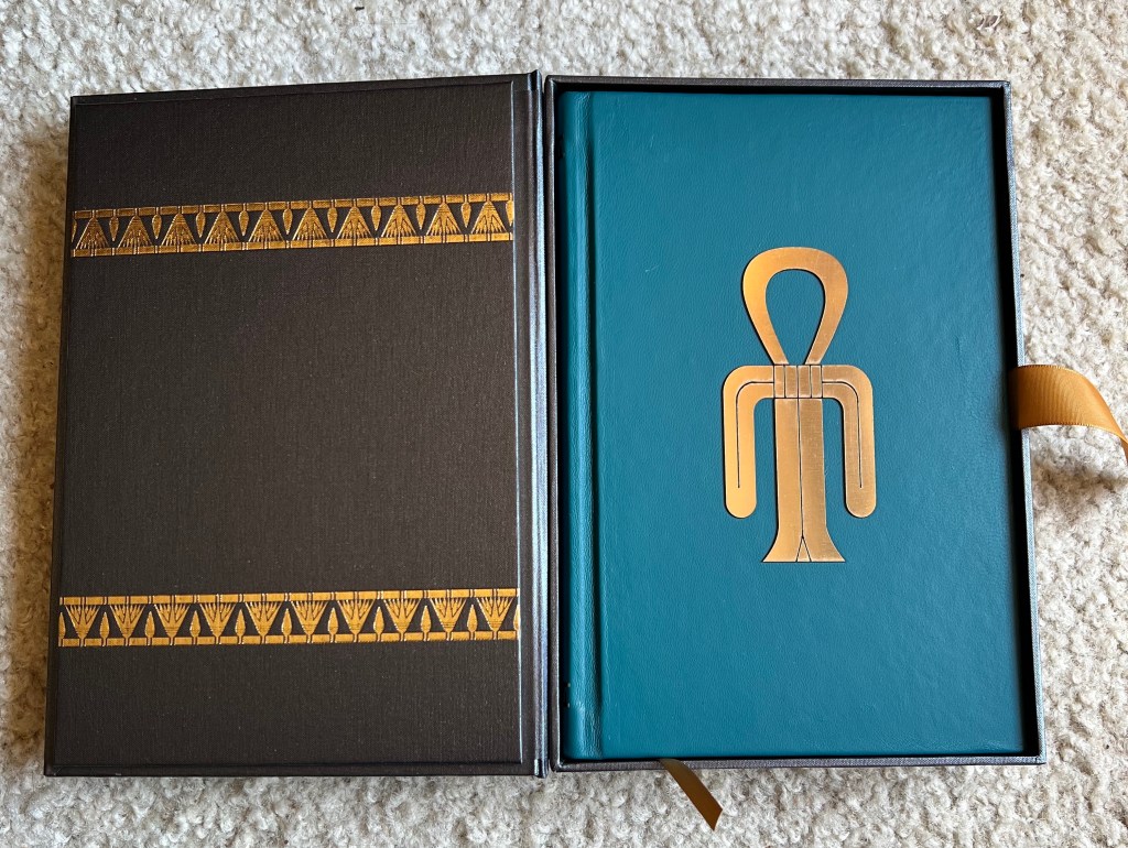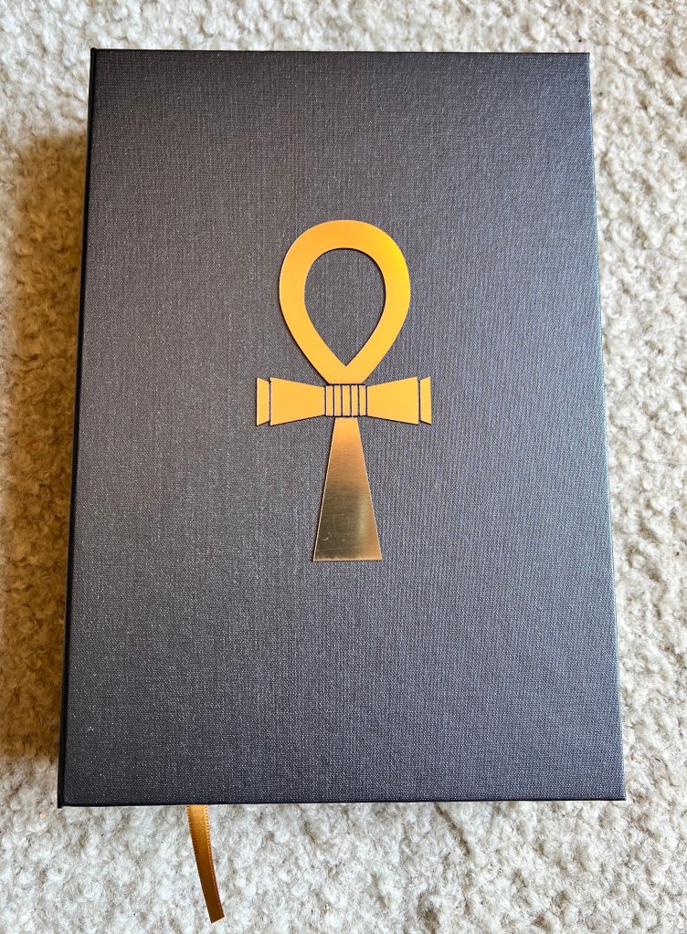 First, you see a slightly silvered, black book case with a beautiful brass ankh on the front and a gold book title on the spine of the case. Like this: