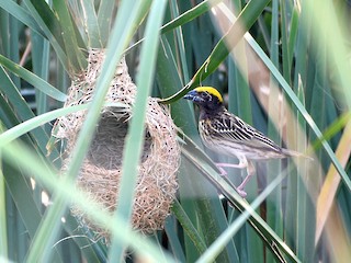 The male Streaked Weaver builds the exterior of the nest to attract the female. Once she says yes, she completes the interior of the nest, readying it for the eggs and chicks.