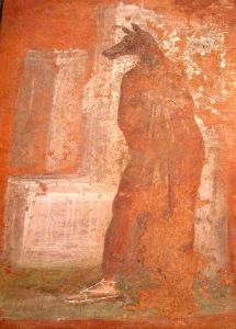 Finally, there are references in Roman literature that connect Anubis with sexy doings. One is the name of a popular farce called The Adulterous Anubis. The other is one of Juvenal’s satiric poems that says priests in the guise of Anubis were the ones who interceded for wives who had not managed to maintain the Chastity of Isis…for a nice bribe, of course.
