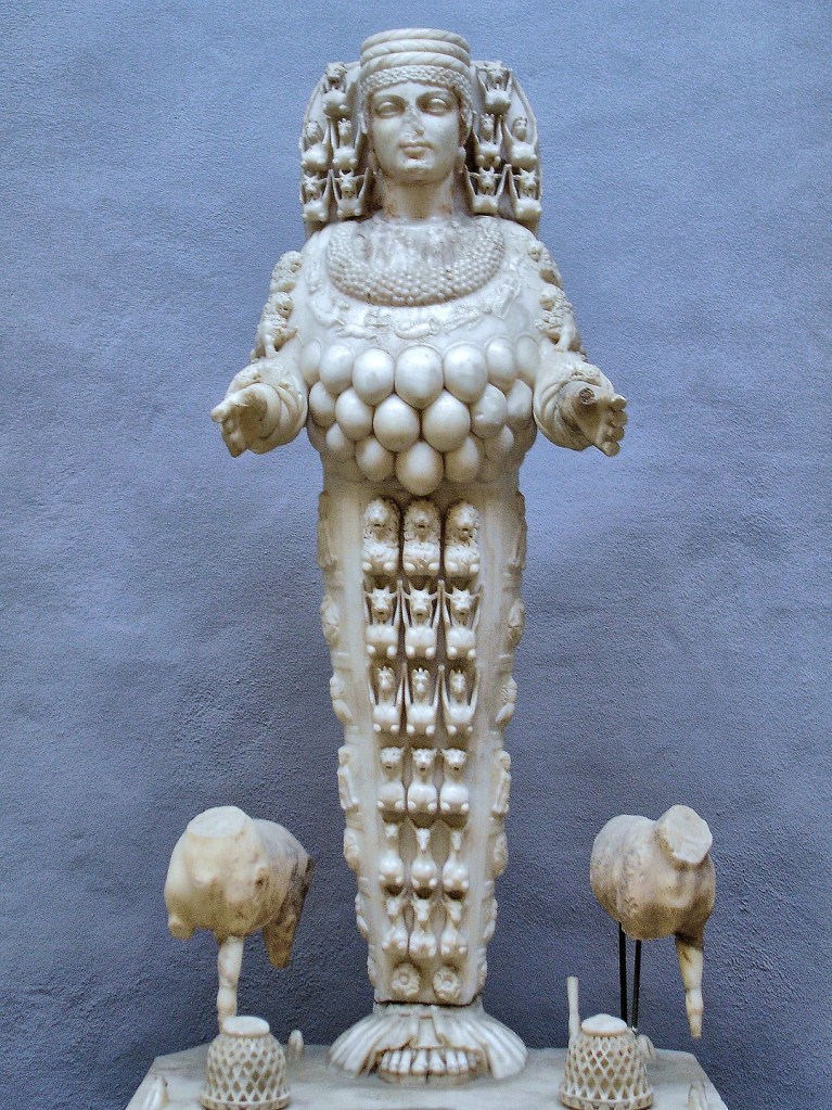We know a little about the religion of the Amazons—at least what some Greeks said about it. Appollonius of Rhodes, ancient Greek poet, scholar, and librarian at the Library of Alexandria, says that the Amazons honored a large, black stone placed on an open-air altar. As it turns out, the Great Mother Kybele was worshipped in just such an image. And Diodorus Siculus says that the Amazons worshipped the Mother of the Gods (often Kybele or Rhea) and consecrated the island of Samothrace to Her. It would certainly make sense that the Great Mother would be the Deity worshipped by this woman-centered society—even if Ares (see last week’s post) was their sperm-donor dad. The worship of the Great Mother was extremely prominent in Asia Minor. And the most well known of these ancient Great Mothers is Artemis of Ephesus.